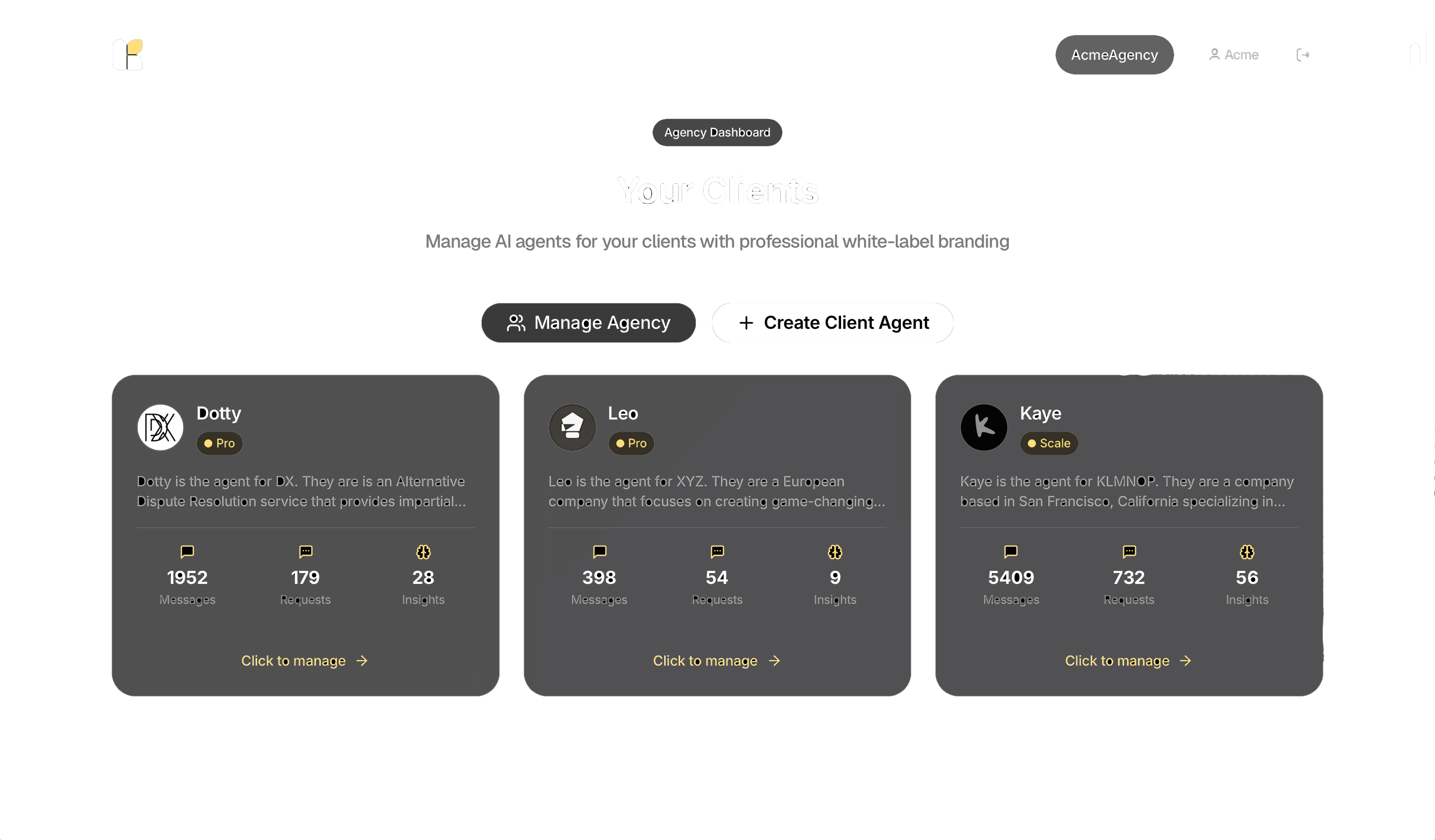 Launch fully white-labelled agents in minutes. Trained on each client’s content and built to generate recurring revenue.